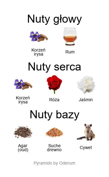 - Nuty głowy: Korzeń irysa, rum, oud