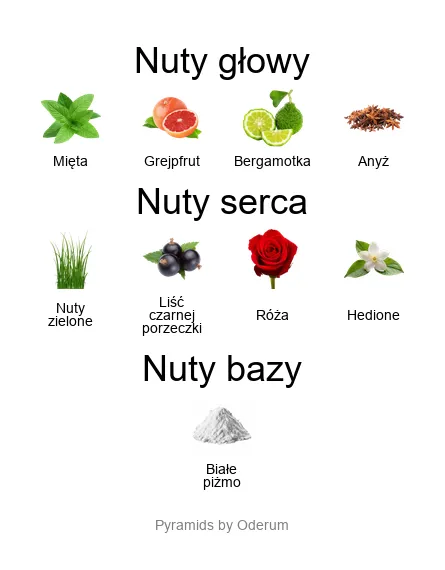 Nuty bazy: Na zakończenie kompozycji pojawia się białe piżmo, który subtelnie osadza zapach na skórze, dając mu cieplejszy, ale wciąż lekki, orzeźwiający charakter. To nuta, która nadaje perfumom głębi, sprawiając, że są trwałe, ale nie przytłaczające.