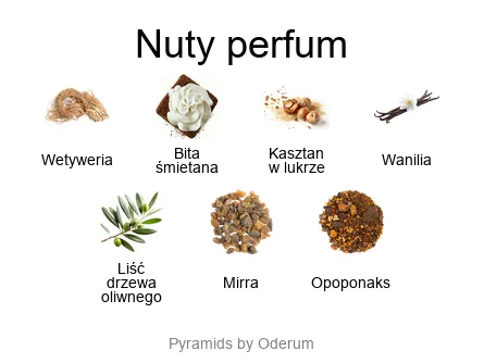 Zapach otwiera się wyraźną nutą wetywerii, która stanowi fundament całej kompozycji – to esencja natury, ziemistości i autentyczności. Wetyweria od wieków jest symbolem elegancji i klasy, ale tutaj ukazuje się w zupełnie nowym wydaniu: współczesnym, nieoczywistym, delikatnie słodkim, ale wciąż z wyczuwalnym, głębokim charakterem. Jej szorstkość zostaje przełamana kremowym akcentem bitej śmietany, który wprowadza miękkość i zmysłowe otulenie, nadając zapachowi niemal kulinarnego ciepła. W tle pojawia się subtelny aromat kasztanów w lukrze, który wnosi poczucie słodyczy, komfortu i delikatnej nostalgii. To otwarcie zaskakuje swoją harmonią – łączy kontrasty w sposób spójny i przyciągający uwagę, tworząc aurę elegancji z nutą ekscentryzmu.