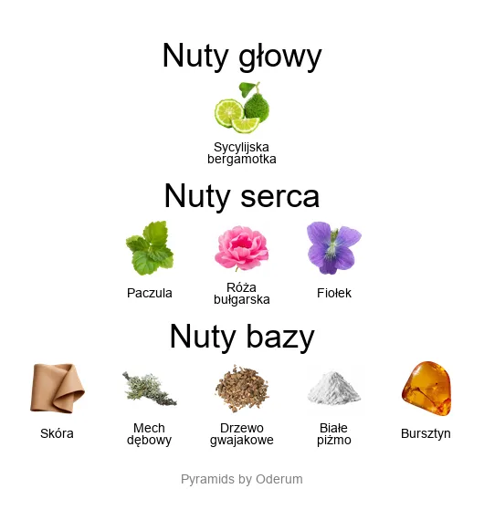 - Nuty bazy: skóra, mech dębowy, drzewo gwajakowe, białe piżmo, bursztyn – potężna, zwierzęca i otulająca baza, która nadaje zapachowi charakteru i niezwykłej trwałości.