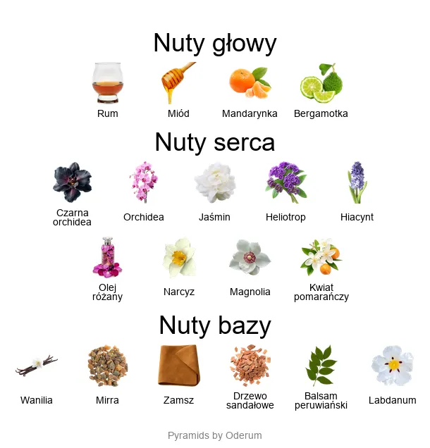 W sercu zapachu dominuje czarna orchidea – symbol tajemniczości i głębi, w towarzystwie delikatnego jaśminu, heliotropu, hiacyntu, narcyza i kwiatu pomarańczy. Każda nuta została starannie dobrana, aby tworzyć harmonijną i zmysłową całość, która utrzymuje się na skórze przez wiele godzin. To idealny wybór dla osób poszukujących perfum luksusowych o trwałej projekcji.